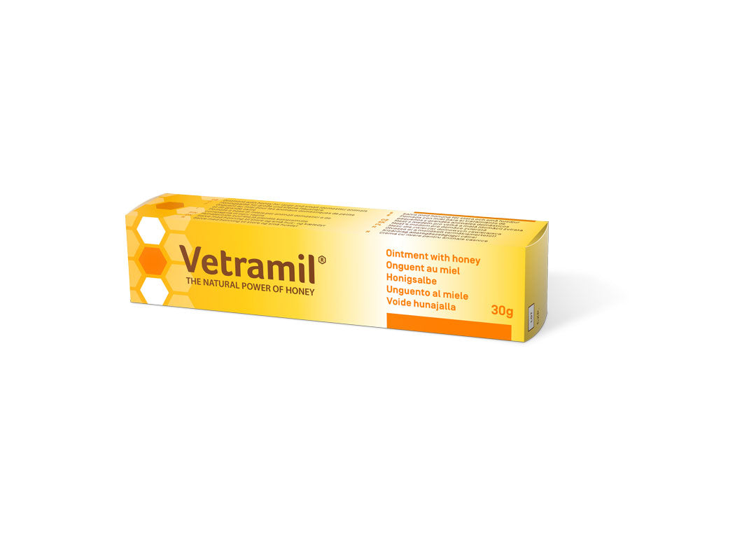 Vetramil Merhem, sert ve tahriş olmuş deriye sahip hayvanlar için özel olarak hazırlanmıştır. Vetramil bal merhemi, yüksek oranda doğal enzimler barındıran bal içerir. Bal, deri sağlığını korumada önemli özellikleriyle tanınır. Baldaki enzimler ve düşük pH, deri temizliğinin korunmasına yardımcı olur ve cildin doğal iyileşme kapasitesini destekler. Balın içeriğindeki antioksidanlar, hassas ve tahriş olmuş ciltler için yatıştırıcı özelliğe sahiptir. Vetramil bal merhemi, ayrıca deri sağlığının korunmasına yardımcı olmak ve merheme hoş bir koku vermek için özel esansiyel yağlar içerir. Vetramil merhem, tüm hayvanlar için kullanılabilir.